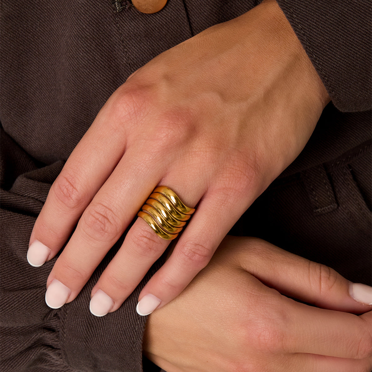 L’anello Riflessi è un gioiello dal design moderno e deciso, pensato per valorizzare ogni gesto con eleganza. Le linee ondulate e sovrapposte, dal finish bicolore dorato, creano un effetto dinamico e luminoso che non passa inosservato.